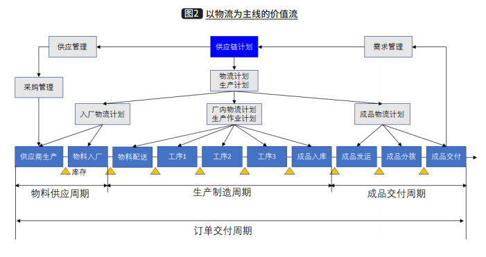 物流規(guī)劃的重點在于創(chuàng)建連續(xù)流,創(chuàng)造快速流動的基礎條件。如圖2所示,以物流為主線,從端到端的角度看待價值流,其本質是用合理的、較低的成本提供較高的交付服務水平,在這樣一個復雜系統(tǒng)中,整體均衡比局部高效更重要,全局協(xié)同比節(jié)點執(zhí)行更重要。以物流為主線的價值流優(yōu)化,應以計劃協(xié)同為驅動,實現(xiàn)時間和庫存的合理規(guī)劃,其目的在于準確地響應需求、縮短交付時間和降低庫存。因此,需要對物流過程進行整體的規(guī)劃,以實現(xiàn)端到端“事實上的平衡”。
