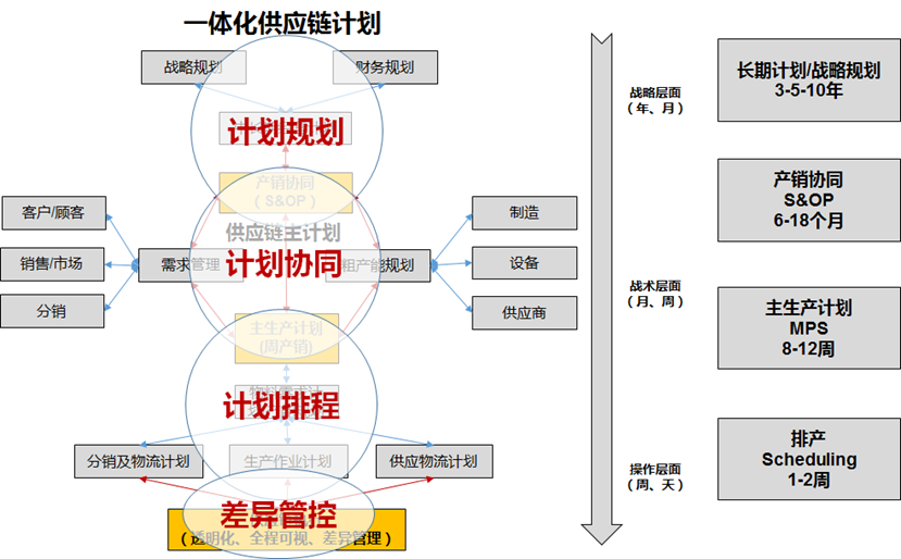 供應(yīng)鏈一體化計(jì)劃體系要從橫向和縱向來(lái)理解:橫向上涉及顧客、門(mén)店、經(jīng)銷(xiāo)商、品牌商、工廠、供應(yīng)商等節(jié)點(diǎn)之間的計(jì)劃拉通,包括銷(xiāo)售計(jì)劃、需求計(jì)劃、生產(chǎn)計(jì)劃、采購(gòu)計(jì)劃、物流計(jì)劃等計(jì)劃之間的拉通與協(xié)同;縱向上包括長(zhǎng)期年度規(guī)劃、中期產(chǎn)銷(xiāo)協(xié)同計(jì)劃、主生產(chǎn)計(jì)劃與作業(yè)計(jì)劃排程等各維度之間的傳承與呼應(yīng)。